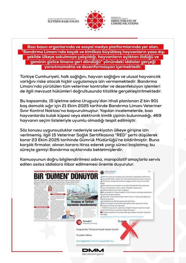 DMM’nin NSosyal hesabından yapılan açıklamada, bazı basın organlarında ve sosyal medya platformlarında yer alan “Bandırma Limanı’nda kaçak ve kimliksiz büyükbaş hayvanların yasa dışı şekilde ülkeye sokulmaya çalışıldığı, hayvanların açlıktan öldüğü ve geminin gizlice limana döndüğü” yönündeki iddiaların dezenformasyon içerdiği belirtildi.